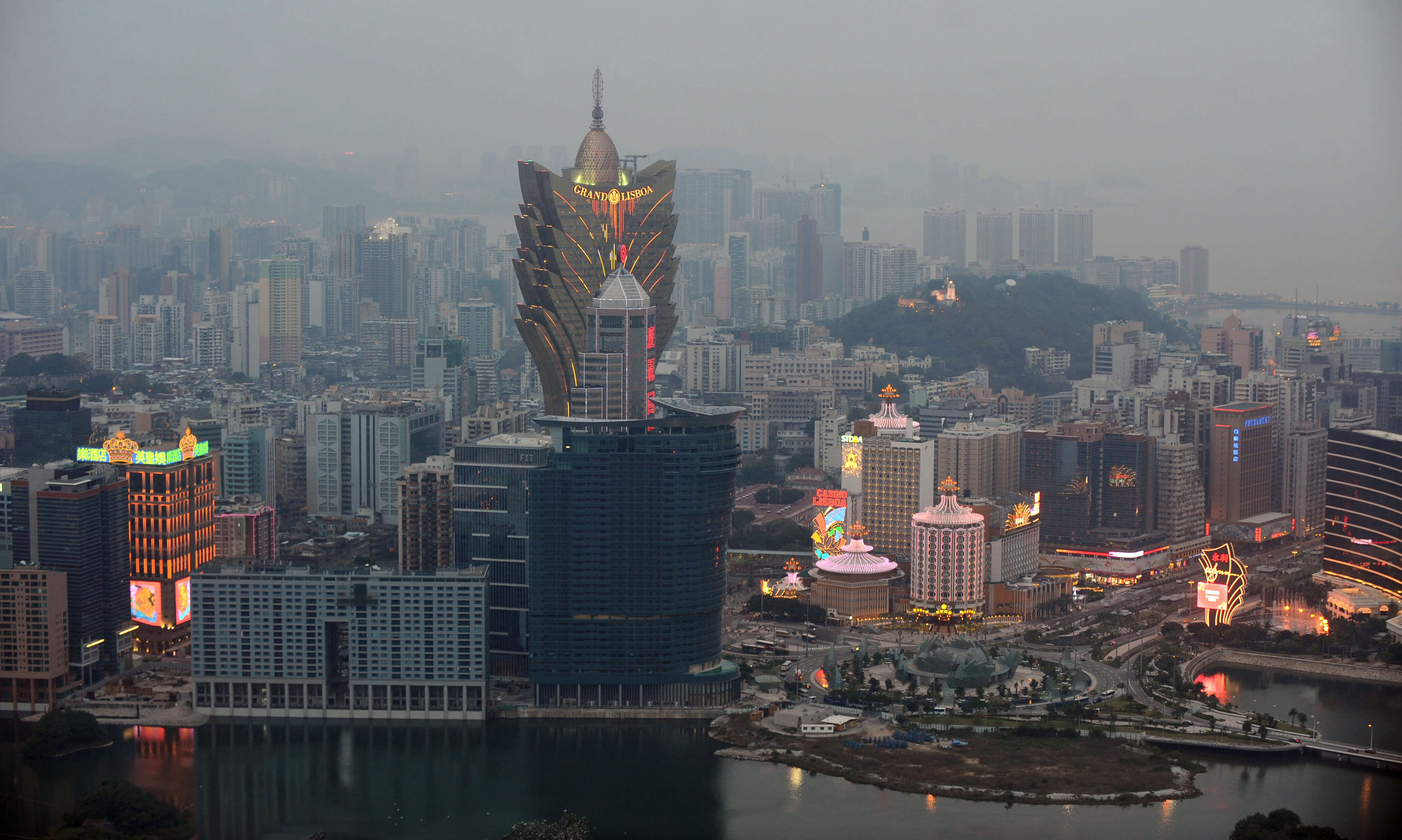 A photograph of the Macau skyline in which the iconic Grand Lisboa casino is visibly towering over the casino district.