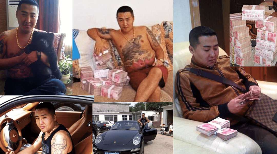 An alleged Chinese mobster had images from his phone leak onto the web flaunting stacks of money, tattoos and luxurious cars.