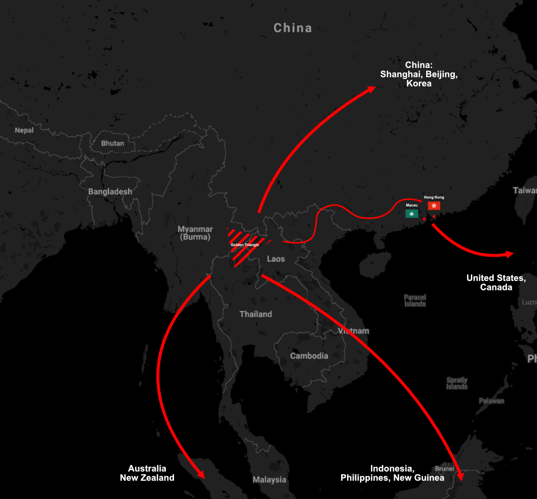 Heroin and methamphetamine is produced in the Golden Triangle and then smuggled to the Eastern corners of the world. Important destinations are Australia, New Zealand, the Asia Pacific but also China, Canada and the United States.