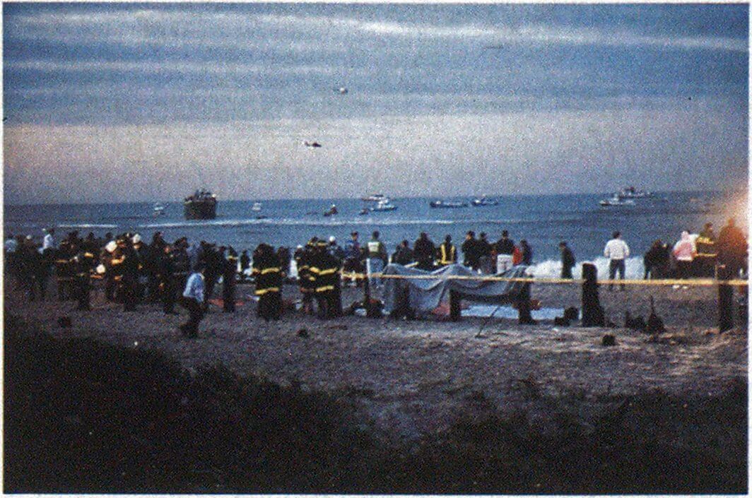 Firemen, rescue workers, coast guard and police watching over the Golden Venture operation in New York, 1993.